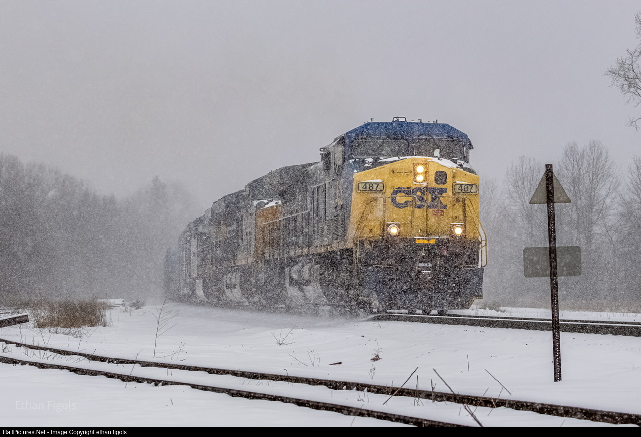 | CSXT 487, still in its YN2 paint, leads M426 eastbound through Chatham through the heavy snowfall. |