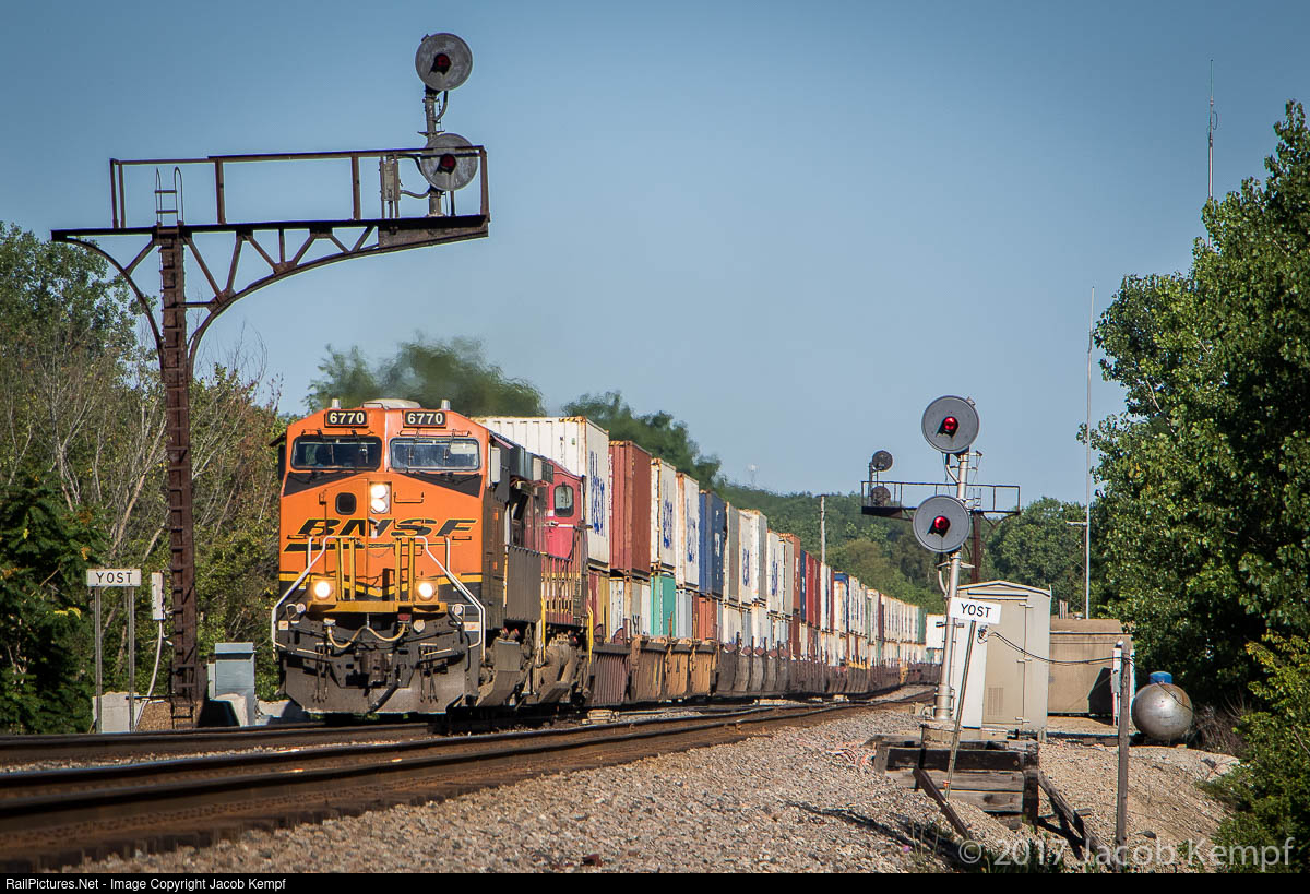 | A newer Evolution Series unit leads a former Santa Fe GE on an eastbound stack train past the leaning signals at the Yost Interlocking on the east side of Galesburg. BNSF was actively replacing the old ATSF signals along this line during the Summer of 2017. By 2018, most of them were gone! |