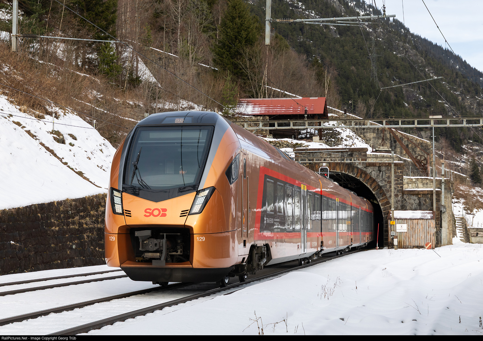 "Traverso" train RABe 526 # 129/229 of the Südostbahn (SOB) is leaving the Entschigtal avalanche protection gallery at Wassen, running as IR 2422 TRENO GOTTARDO of the line IR46 from Locarno to Zürich.