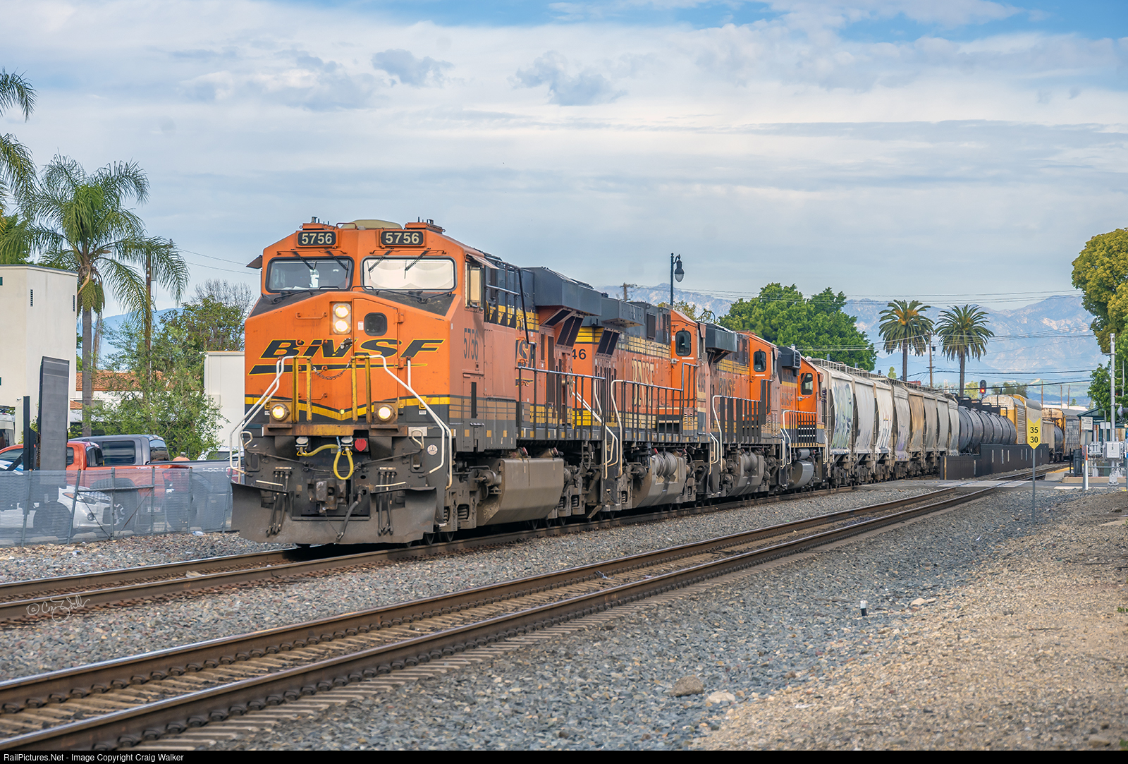Passing through the city of Orange's Metrolink station are BNSF ES44AC 5756, Dash 9-44CW 4346, ES44C4 8175 and GP60 190, with ES44C4 6655 and Dash 9-44CW 4324 shoving on the rear. These freights normally operate at night, but with the line closed for two days for both track and geologic maintenance (due to unstable trackside bluffs along the beach), apparently BNSF was eager to get this train through on Monday morning.