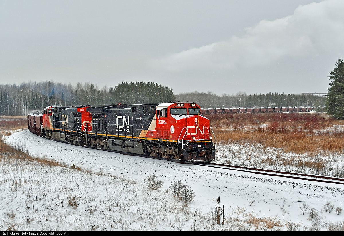 | Loaded out and departing United Taconite, CN 3305 is a couple feet from entering the CN Missabe Sub for the trip back to Proctor yard with iron ore in tow.