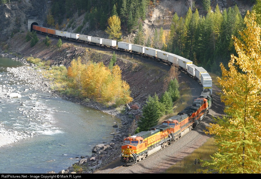 | US Highway 2 provides a great view of westbounds exiting Tunnel 4. This spot is known as Good's Curve, after Forest Service employee Ken Good, who was killed in a plane crash near here in September 2004. Ken kept this spot brush-free for photos. |