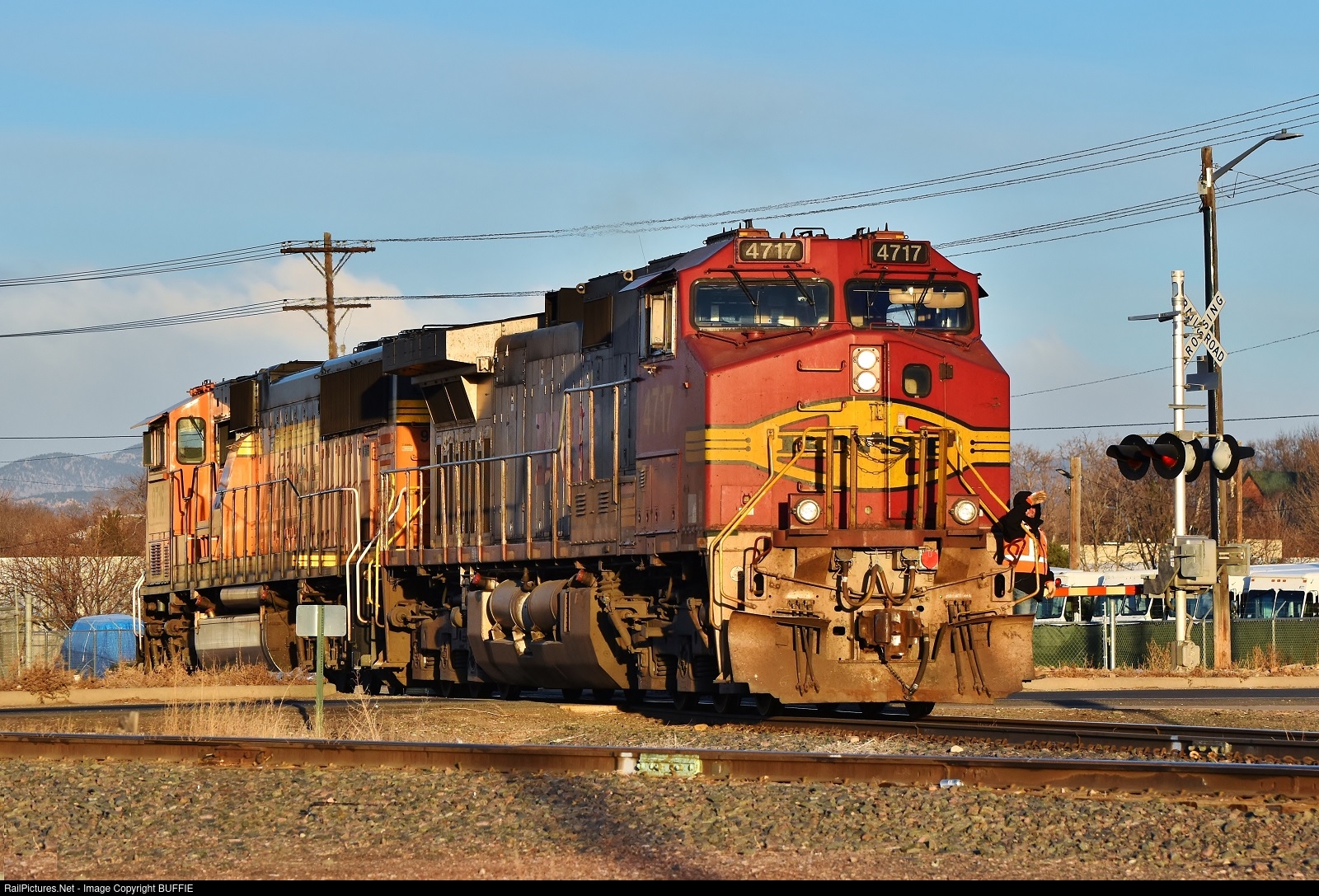 | A crewmember of Warbonnet BNSF 4717 (Dash-9) shields his eyes from the bright sunlight as the pair of engines heads into the yard in Longmont, Colorado.