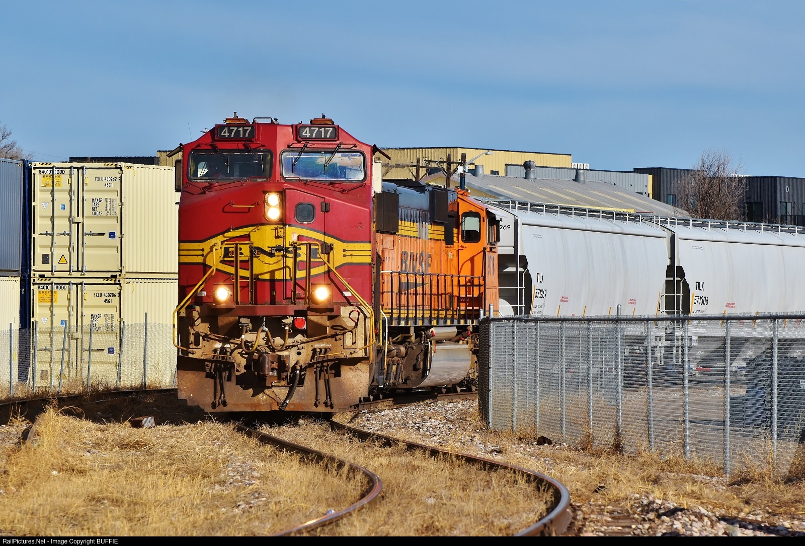 | BNSF Warbonnet #4717 (Dash-9) runs through the S curves and past a stack of containers as it brings a cut of cars out of the yard in Longmont, Colorado.