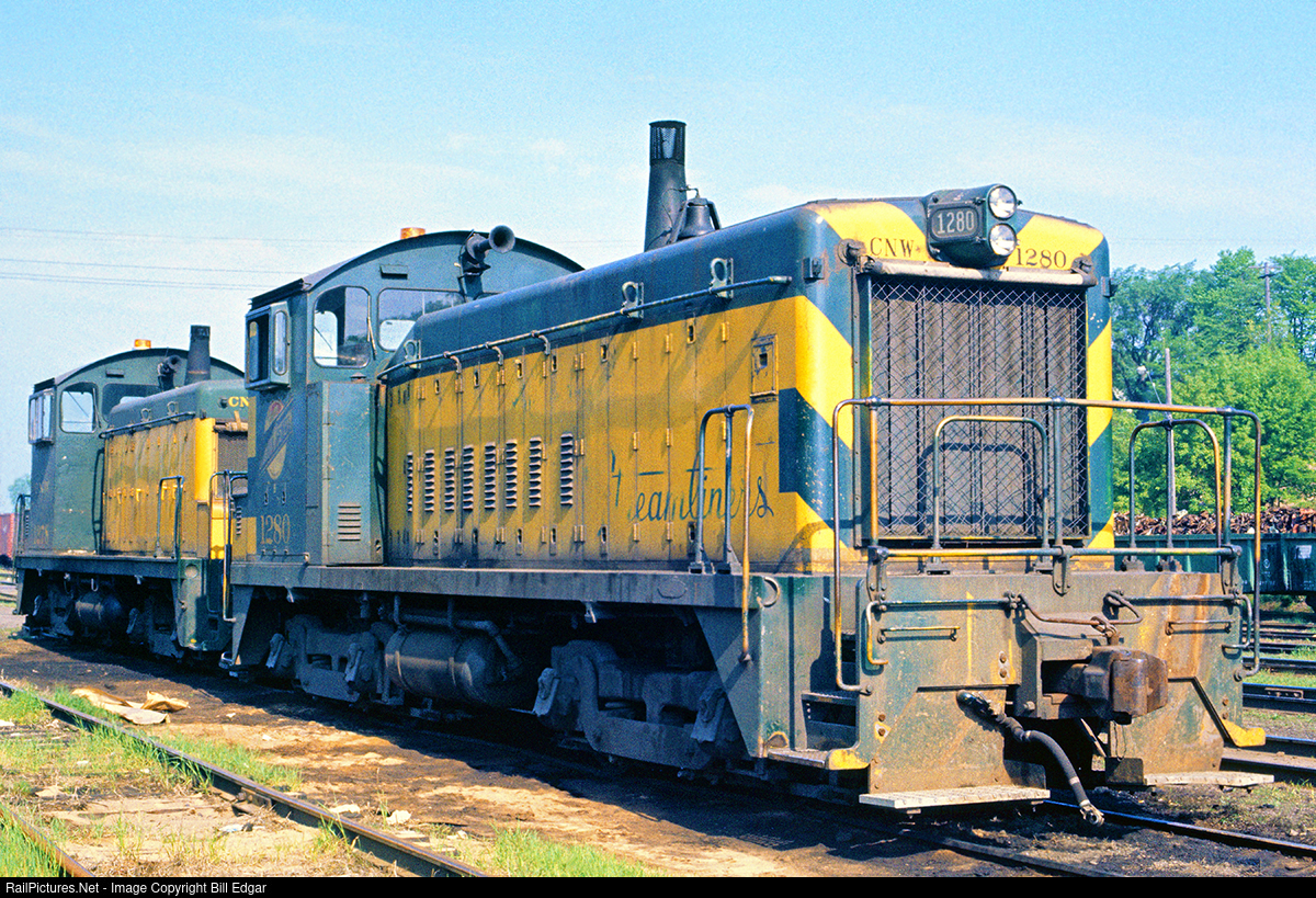 | CNW 1280, SW600 and SW1 1278, SW1 are parked near the CNW station and freight house at Eau Claire Yard just east of the Putnam St. crossing. This was their regular home in between switching assignments and occasional road locals. They were serviced a couple miles east at Altoona Yard & roundhouse. At this time Altoona also serviced a variety of road locomotives ranging from GP7s to SD45s. CNW 1280 is now in possession of Wisconsin Great Northern at Trego, WI. It's 600 HP prime mover has been removed to provide power for their Mark Twain Zephyr project. |