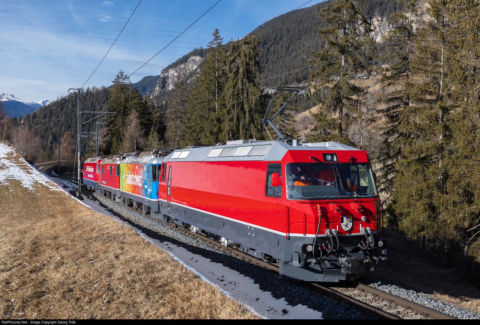 Load test run 9125 of the newly converted Ge 4/4 III # 653 of the Rhaetian Railway (still without any lettering) from Landquart via Chur-Thusis-Tiefencastel-Filisur to Davos, between Filisur and Davos Wiesen. The Ge 4/4 II # 631 and # 624 and the Ge 4/4 III # 642 serve as trailer loads. What looks like a new locomotive fresh from the factory, still without any markings, is in fact a locomotive that is over 30 years old. It was delivered in 1994 by SLM and ABB as Ge 4/4 # 8003 for 900 volts DC to the Montreux-Oberland Bernois (MOB). It was sold to the Rhaetian Railway in 2019 as an addition to the 12 existing Ge 4/4 III # 641 to # 652 locomotives. The engineering and conversion took a very long time, as the locomotive is also to serve as a prototype for a refit program for the existing locomotives.