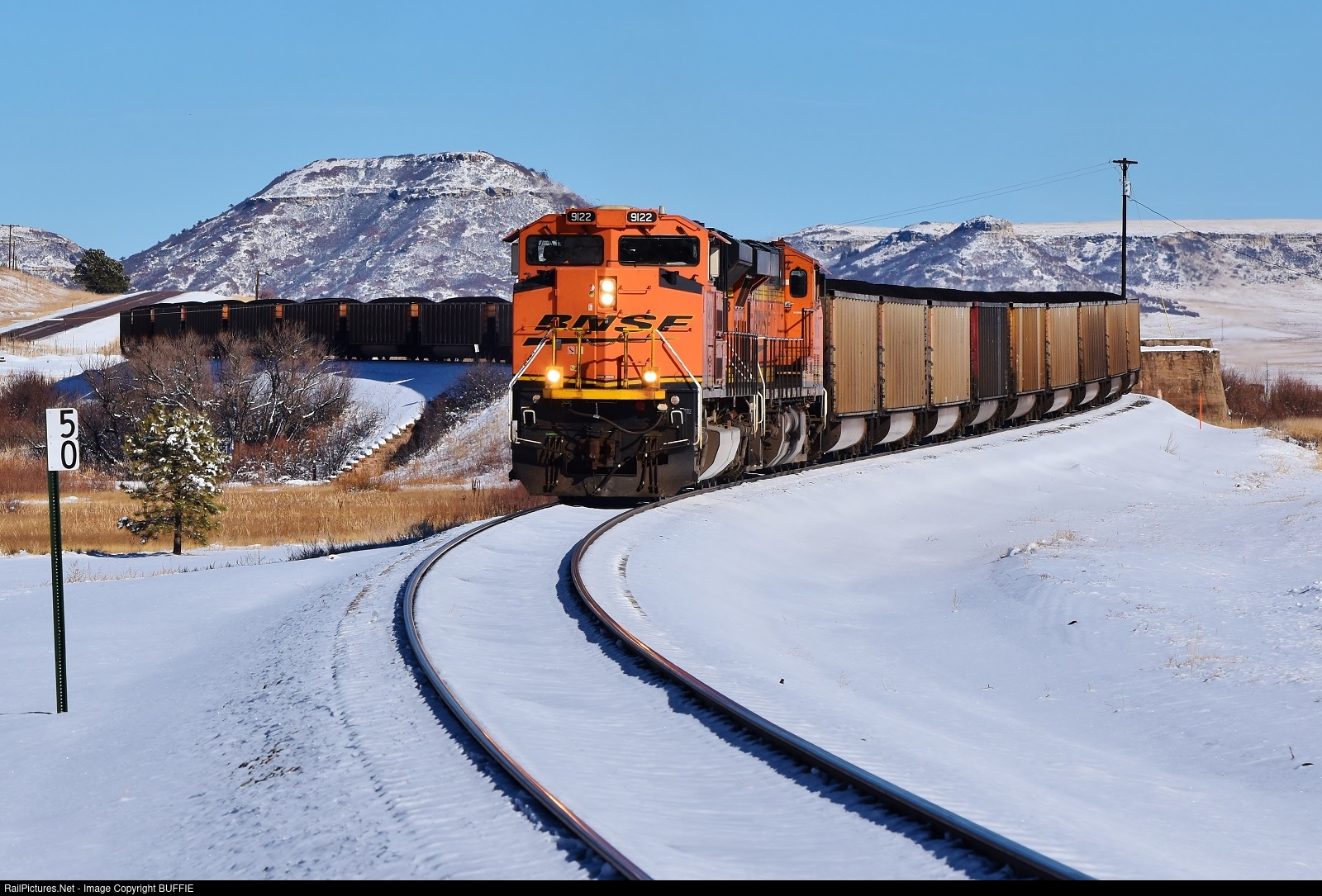 | A fresh layer of snow covers Spruce, Colorado as BNSF 9122 (SD70ACe) leads a loaded coal train south on the Joint Line through the S curve between Greenland and Palmer Lake.