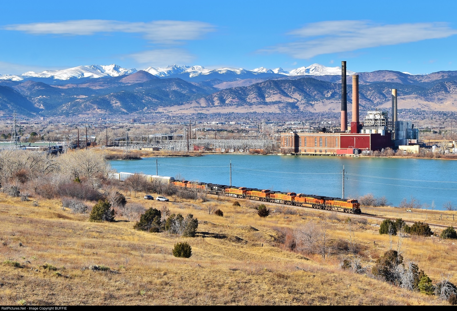 | BNSF 7080 (ES44C4) leads a power-heavy manifest past the shuttered Valmont power plant in Boulder, Colorado as it heads to Denver on the Front Range Sub.