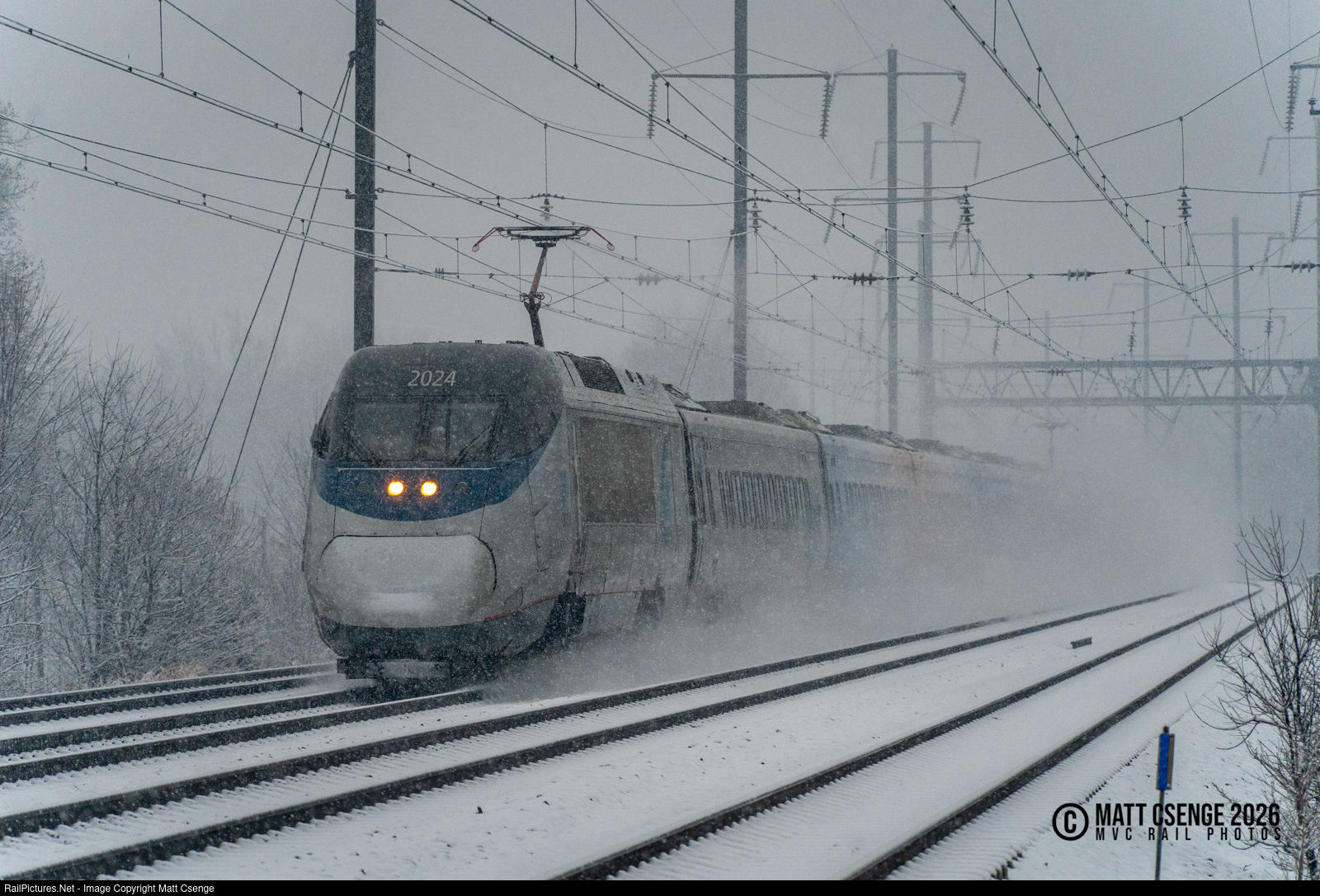 Powering through Powder. Amtrak Acela power car 2024 is seen leading Acela train 2201 west through Pennsylvania, approaching Bristol Station.