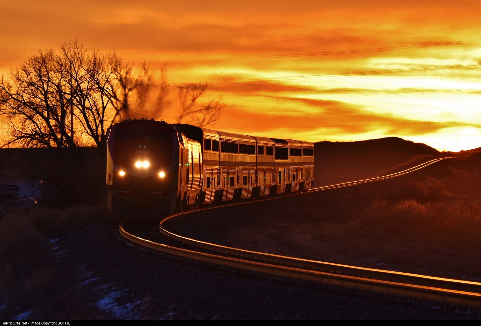 | The California Zephyr heads west on the Brush Sub through Keenesburg, Colorado as an amazing sunrise paints the sky orange. |