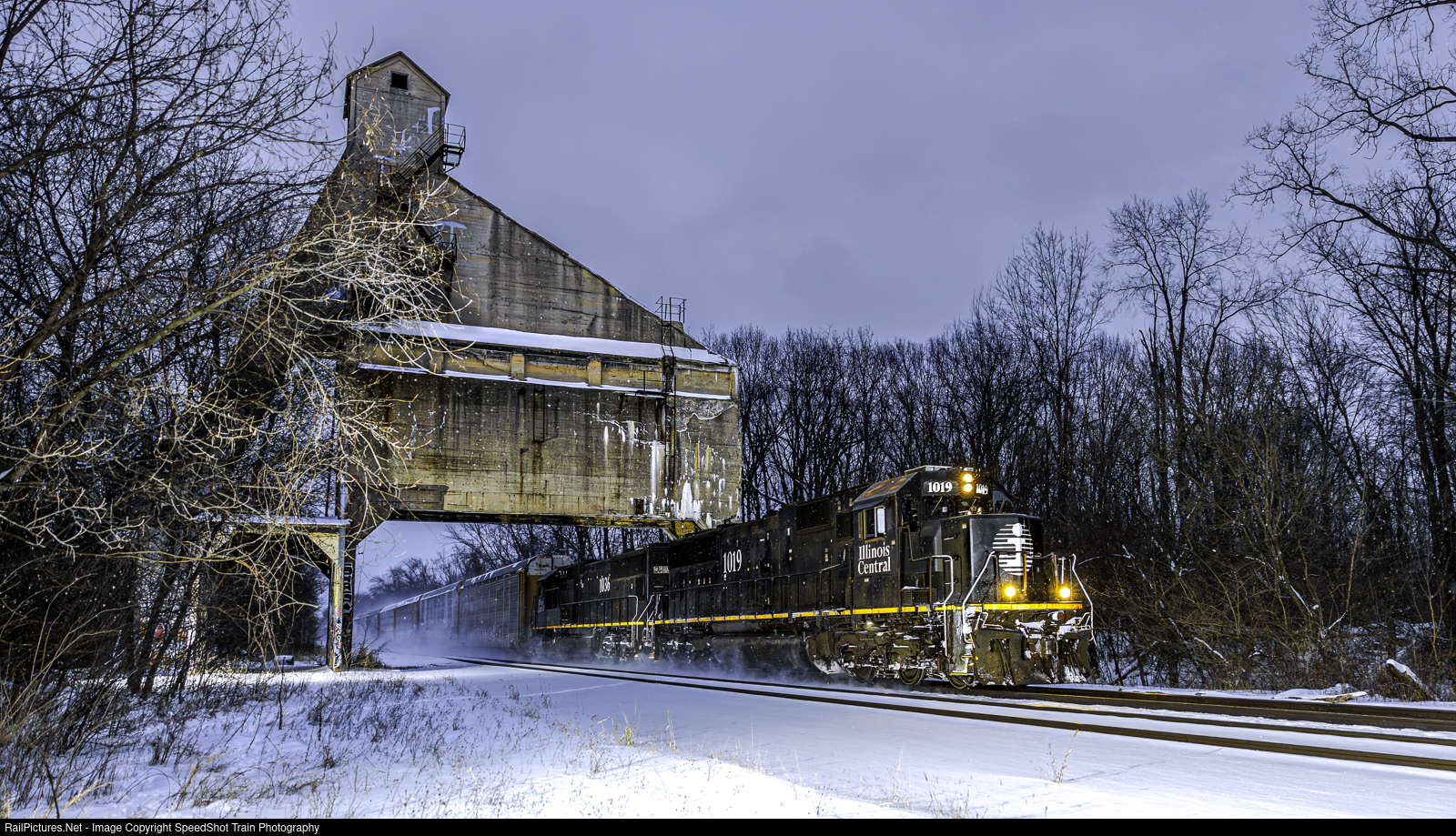 | Duo Deathstars on the CN Michigan Flint Sub - CN E251 w/ IC 1019 and 1036 - Westbound, at the Grand Trunk Coal Tower in Lansing Michigan on a cold Wednesday evening -1 degrees |