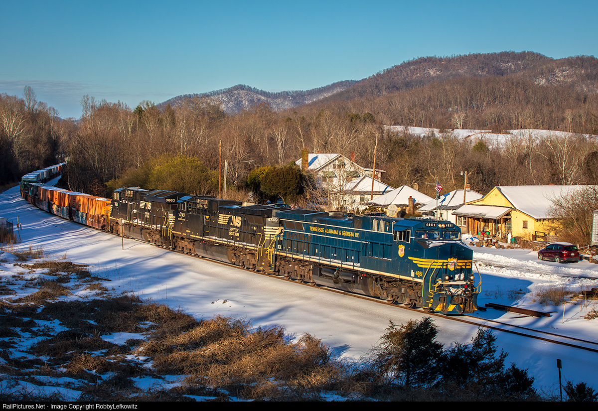 NS 4851, the TAG Heritage Unit, leads hotshot intermodal train NS 25A south through Faber, Virginia, along the NS Washington District. |