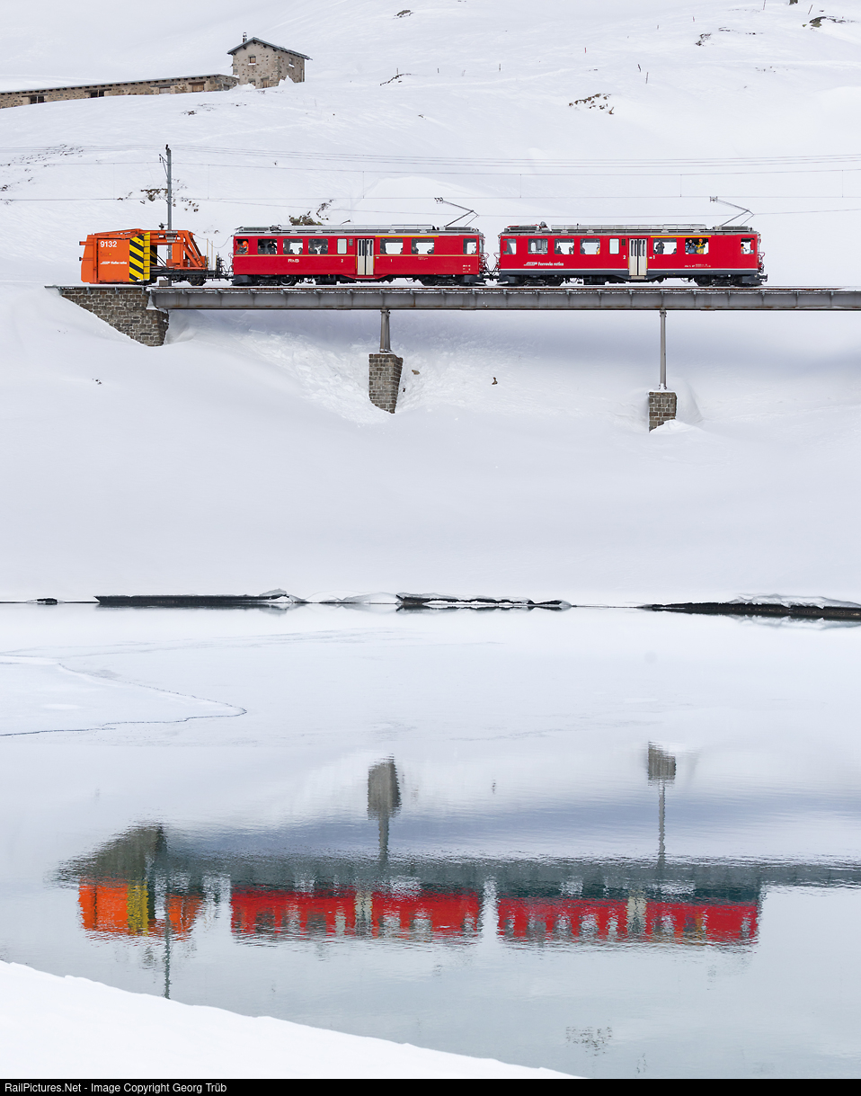 Railcars ABe 4/4 # 46 "Goldliner" and # 47 of the Rhaetian Railway are crossing the "bridge at the Lake" shoving the snow scraper Xk # 9132 during the snow blower event of the RhB on the Bernina line this day.