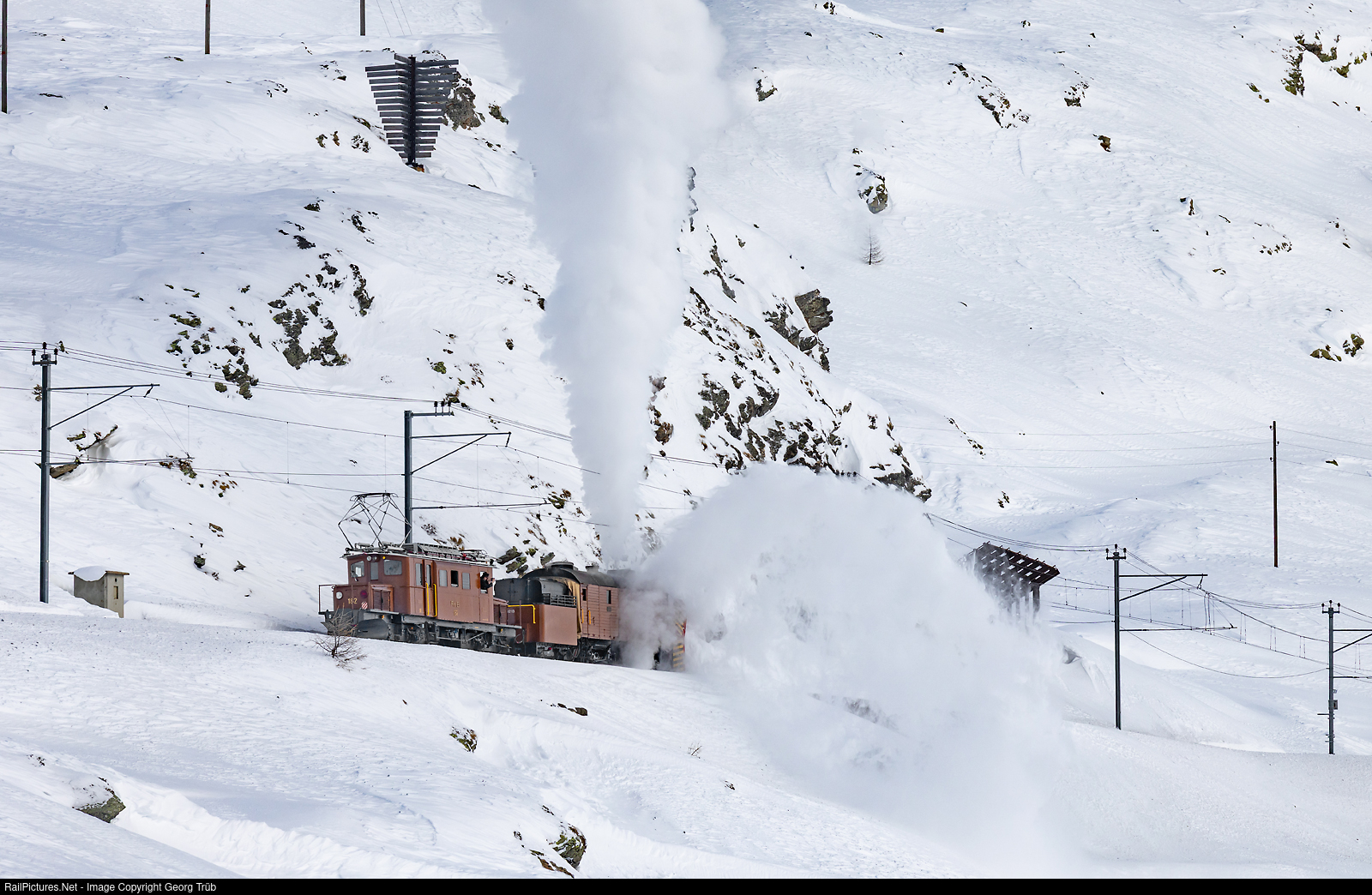 | The historic snowplow composition of the Bernina Railway and the Rhaetian Railway, with the self-propelled "Rotary" steam snowplow X rot d # 9213 of 1910 and the electric locomotive “Bernina Crocodile” Ge 4/4 # 182 of 1928 travels along Lago Bianco on the Bernina Pass at approx. 2250 meters above sea level from Ospizio Bernina heading south. There is little snow, only about half the long-term average for this time of year. The RhB offers a demonstration of snow clearance in earlier times as an adventure trip.