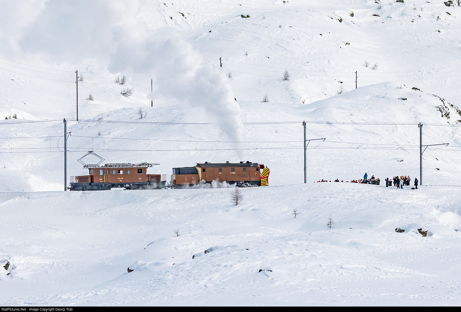 | The historic snowplow composition of the Bernina Railway and the Rhaetian Railway, with the self-propelled "Rotary" steam snowplow X rot d # 9213 of 1910 and the electric locomotive “Bernina Crocodile” Ge 4/4 # 182 of 1928 travels along Lago Bianco on the Bernina Pass at approx. 2250 meters above sea level from Ospizio Bernina heading south. There is little snow, only about half the long-term average for this time of year. The RhB offers a demonstration of snow clearance in earlier times as an adventure trip. The 50 participants on the trip left the two railcars ABe 4/4 # 46 and # 47 on the open line, to observe the snow clearing demonstration of the X rot d # 9213 and Ge 4/4 # 182.