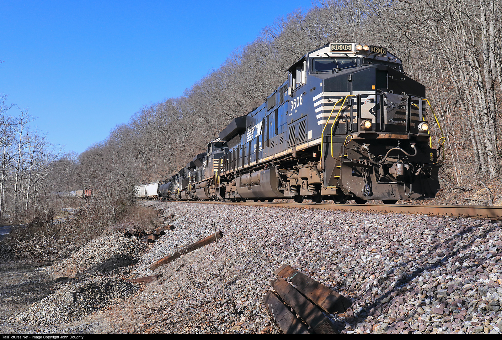| Having left Bluefield, West Virginia, NS 3606 heads eastbound through Hardy on its way to Roanoke, Virginia. |
