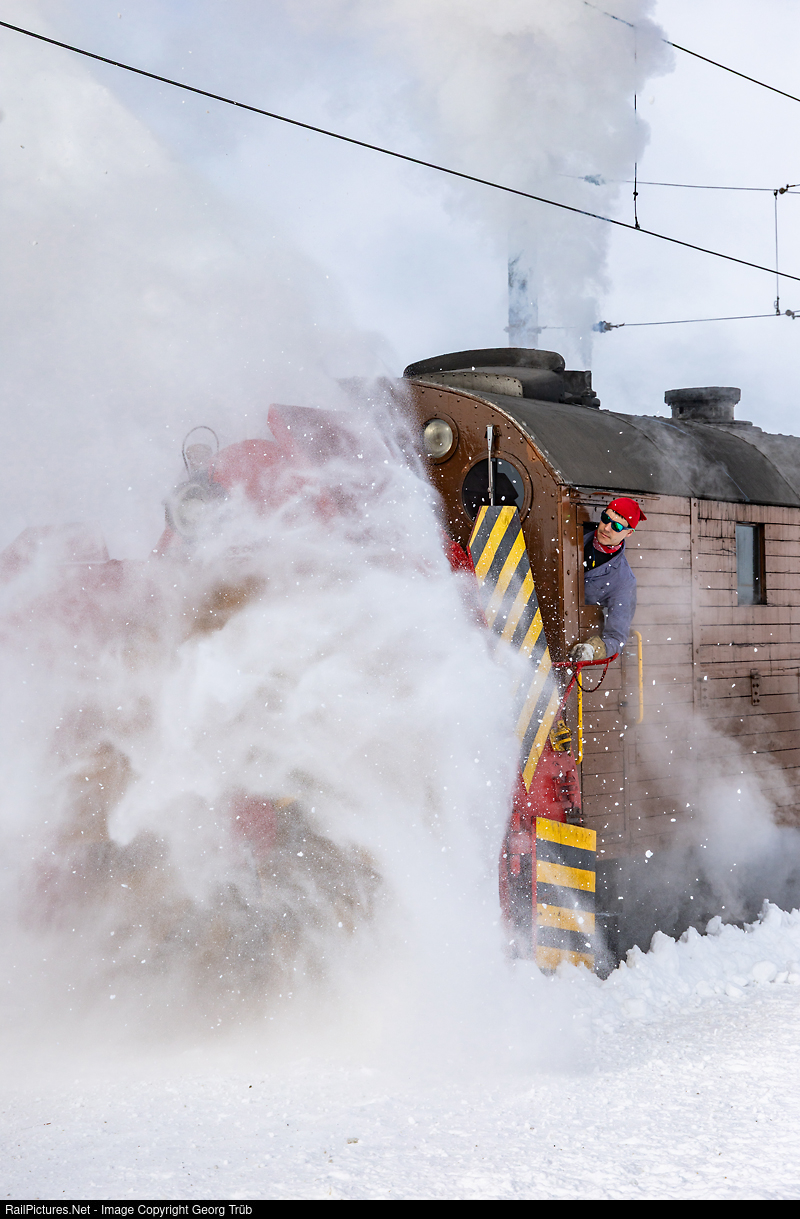 | Action! Self propelled 0-6-0+0-6-0 steam "Rotary" snow blower of the Rhaetian Railway, built in 1910 by SLM Winterthur for the then independent Bernina Railway, is clearing the stub track towards the covered turntable in Ospizio Bernina. |