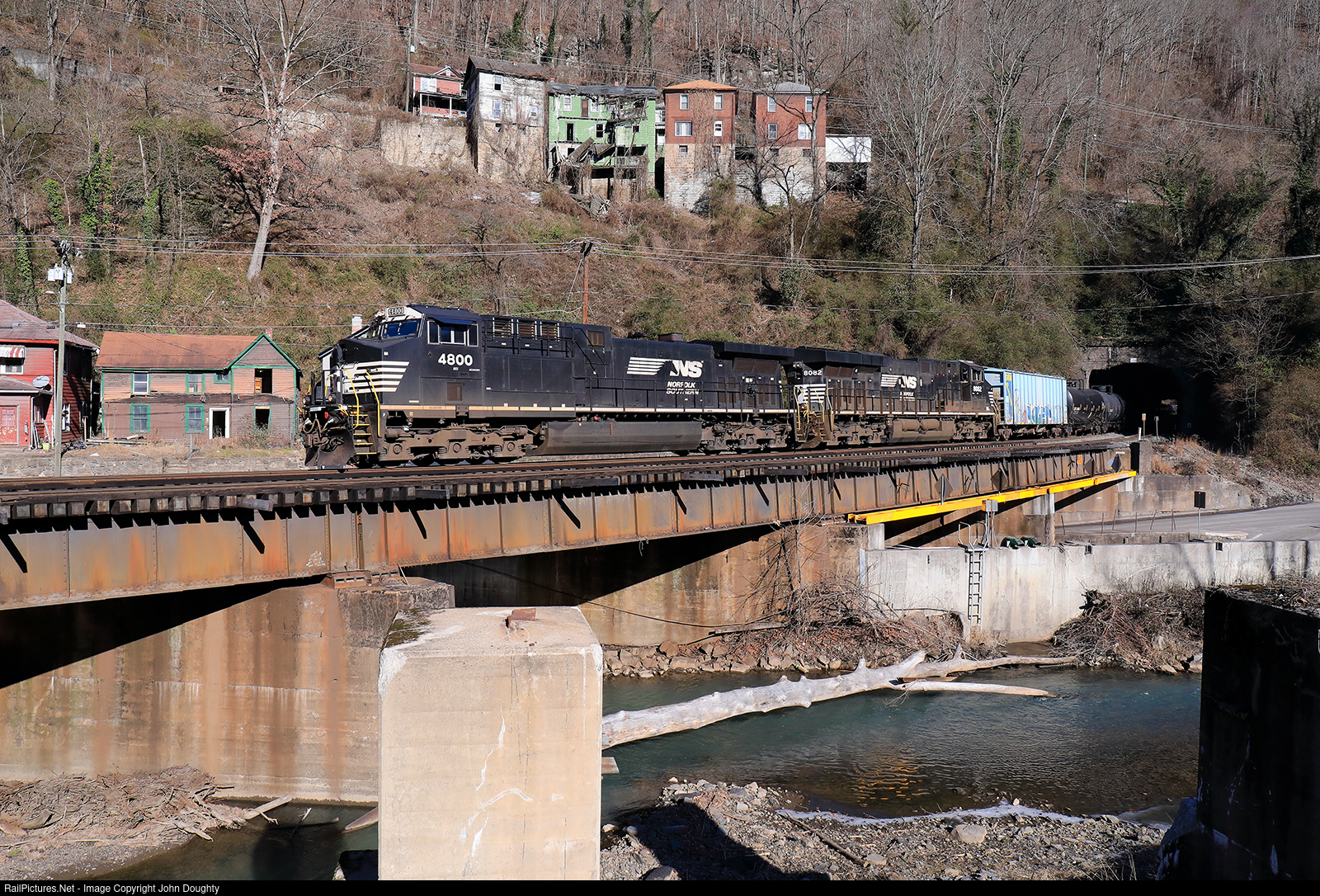| NS 4800 and NS 8082 lead a westbound empty ethanol train out of the Welch tunnel and onto the bridge in Welch, West Virginia. |