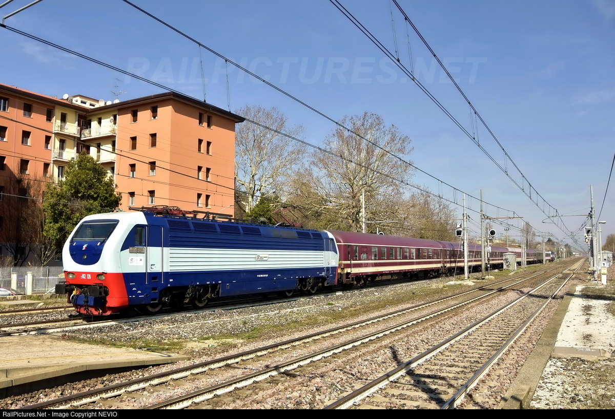 | Passing through Corticella arriving from Venice and headed for Florence, luxury train operated by “FS Treni Turistici Italiani” hauled by an E-402 B locomotive. |