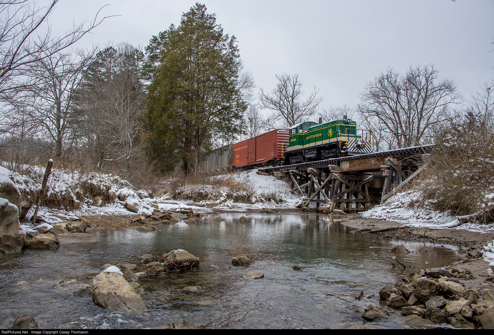 | Southern SW1 #2008 leads freight across a feeder stream for Poplar Creek near Blair, Tennessee, along the Walden's Ridge Railroad. |