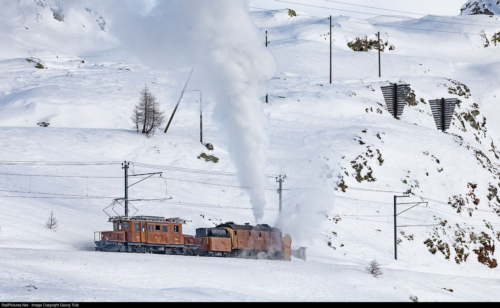 | The historic snow fighting composition with steam snow blower X rot d # 9213 and locomotive Ge 4/4 # 182 of the Rhaetian Railway, former Bernina Railway, is moving along Lago Bianco on about 2250 meter a.s.l. to clear the line towards Alp Grüm. This was the snow fighting adventure trip organised by the Rhaetian Railway. |