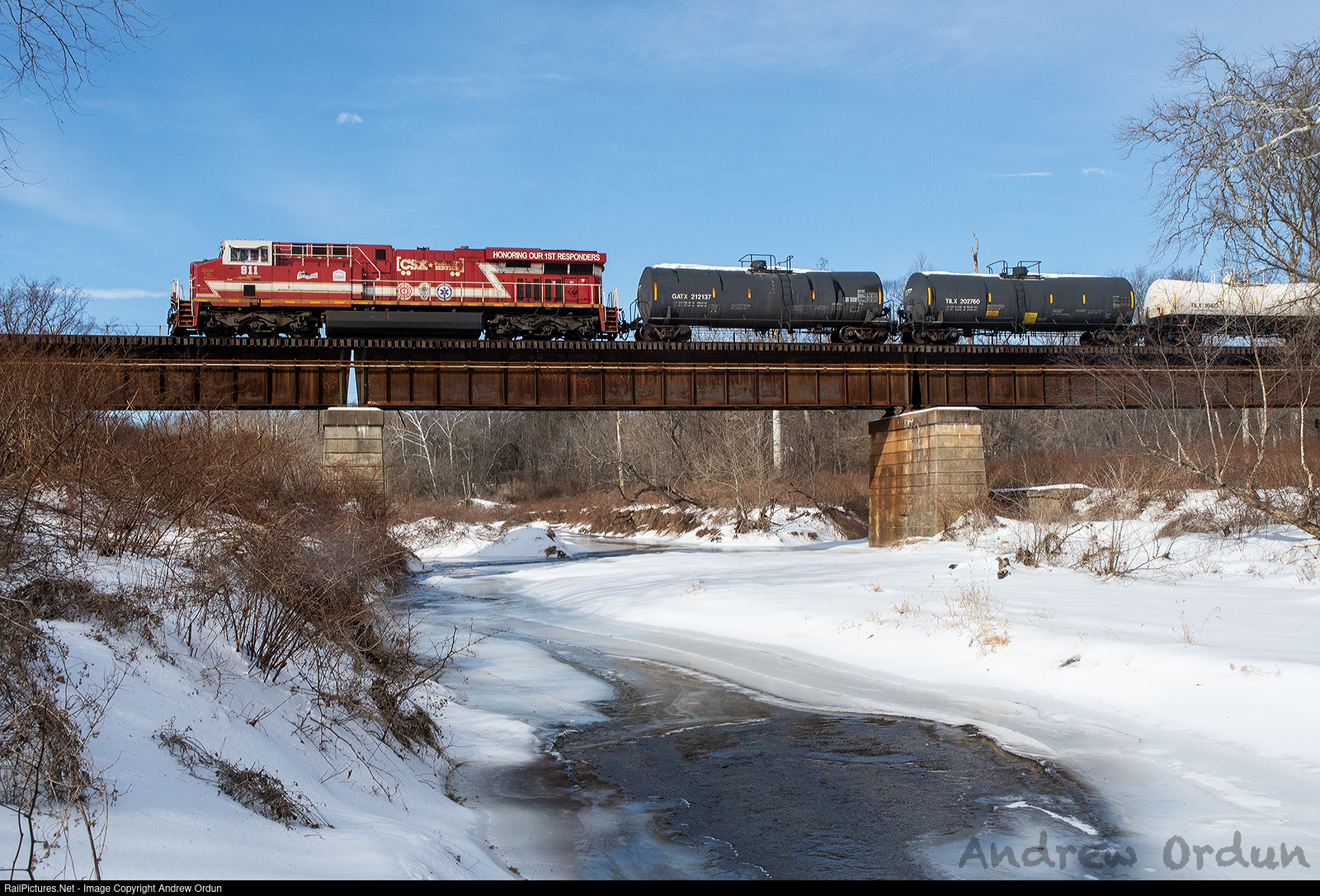 | X409-31, with the Spirit of First Responders hertiage unit leading, crosses the Little Gunpowder Falls. |