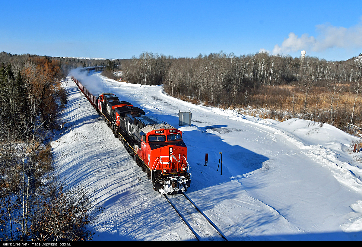 | On a cold afternoon, CN 3347 departs the U.S. Steel Minntac plant with 145 loads of still steaming iron ore. The plant's exhaust in the distance means more hot pellets are being made. |