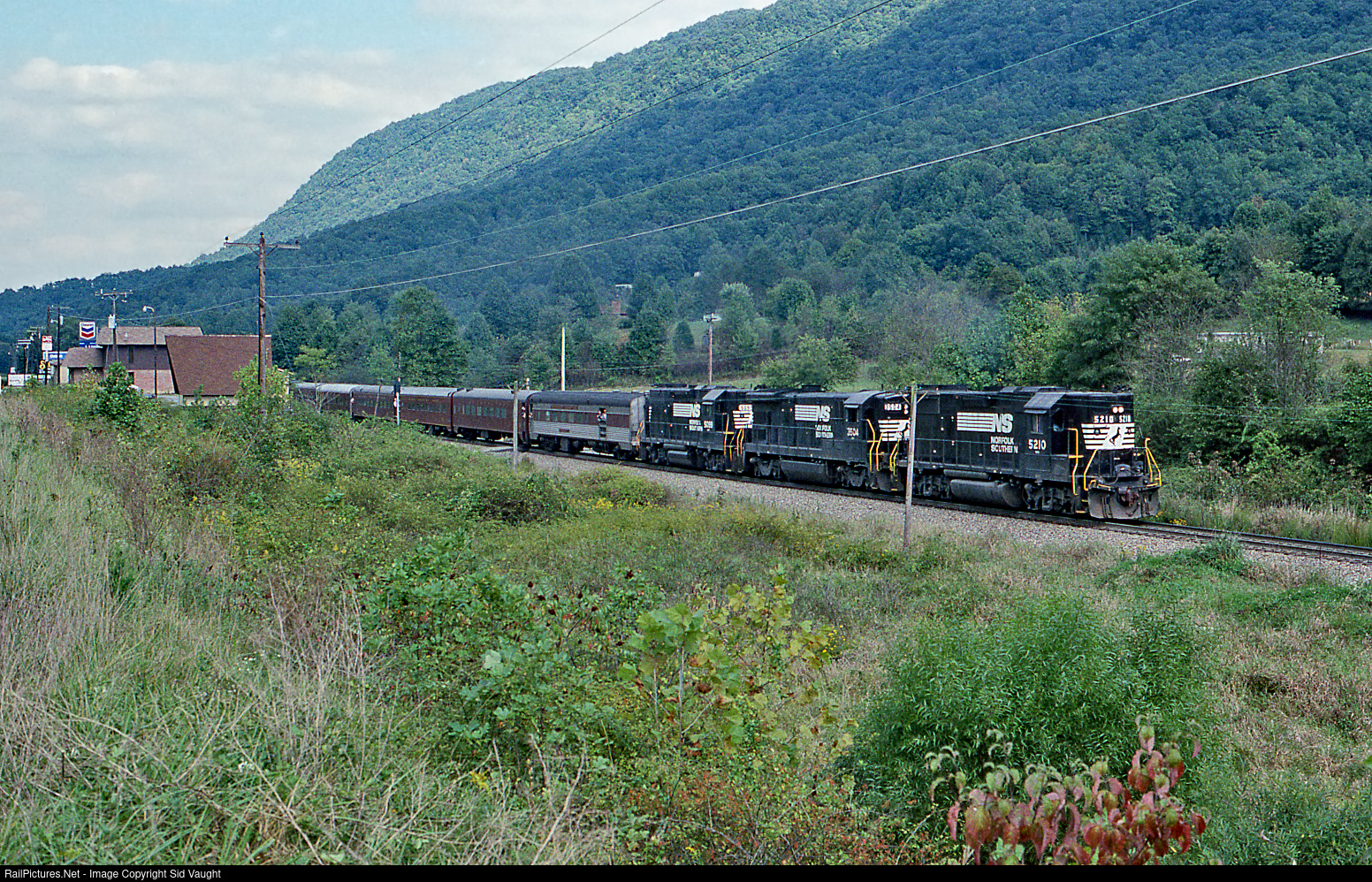 | Watauga Chapter NRHS excursion is proceeding east on NS's former Southern Appalachia Division. Topping the first grade eastbound, leaving the valley of the Powell River, the excursion is heading for home after a pleasant visit to Appalachia. |