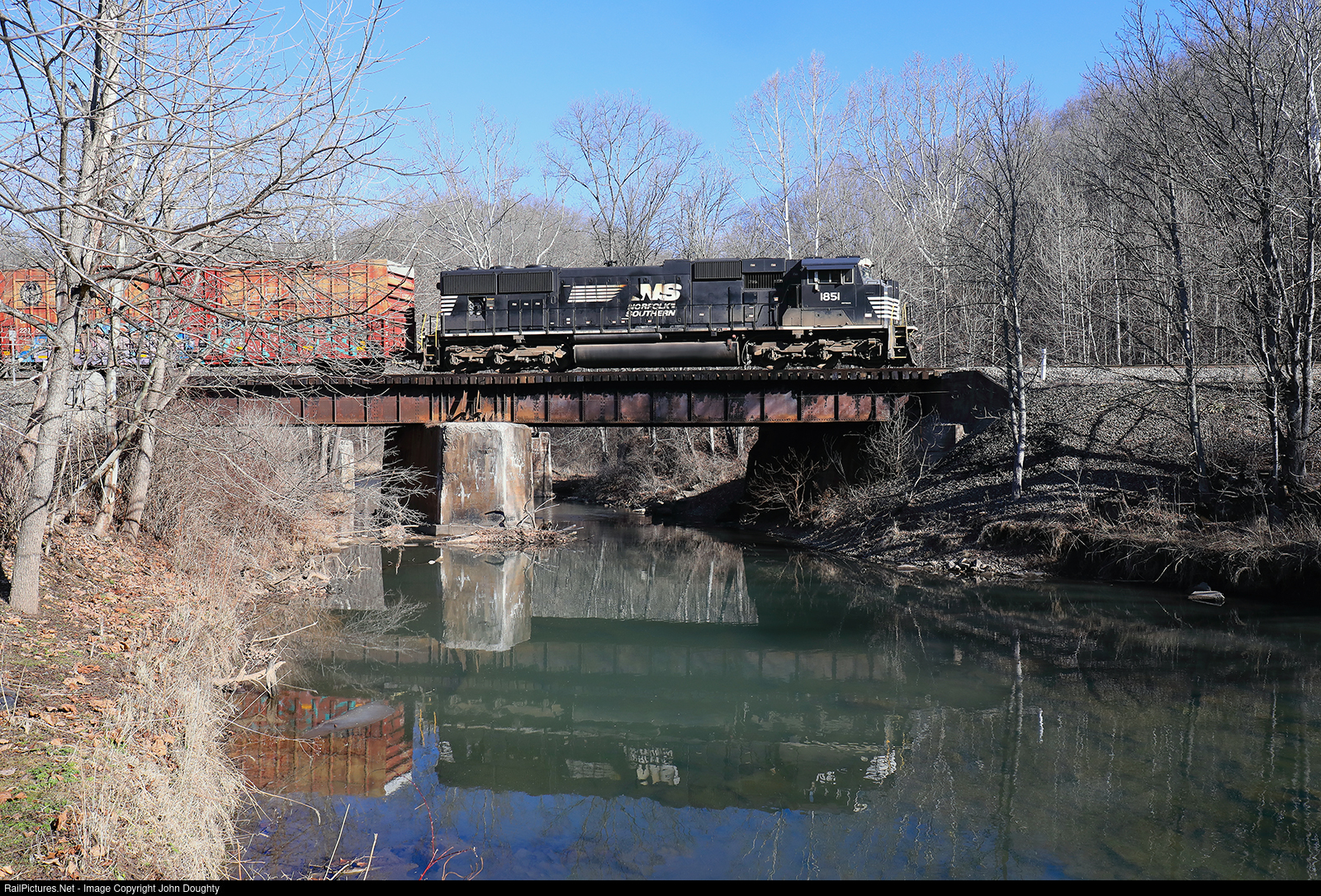 | Norfolk Southern 1851 has finally gotten a green signal to slowly proceed east towards Bluefield as it crosses over the Bluestone National Scenic River near Nemours, West Virginia. |