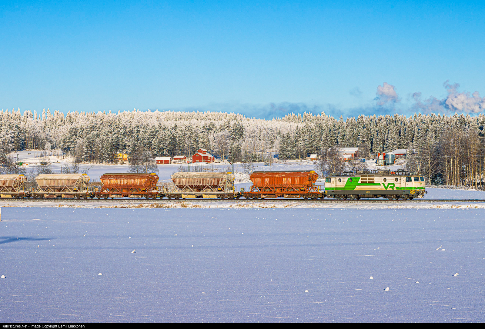 | VR's hopper train to Kotka Mussalo harbour has just departed from Siilinjärvi in a nice cold and sunny winter day. |