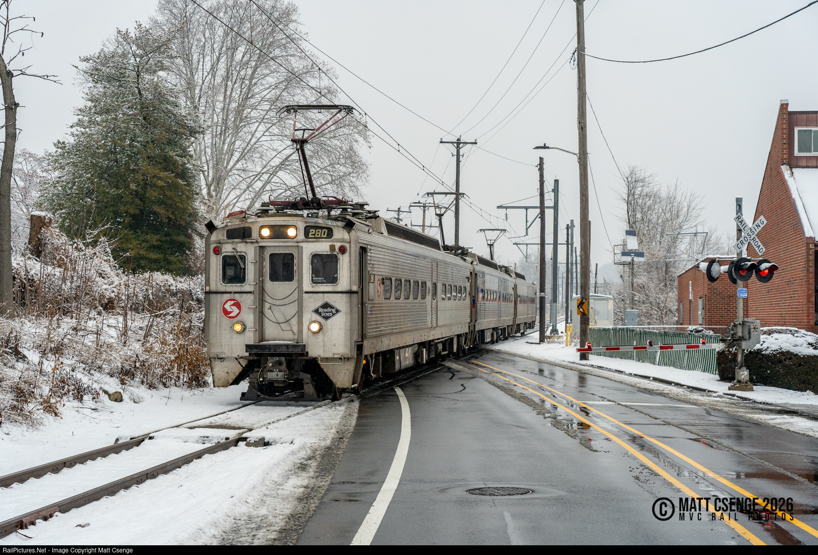 Southeastern Pennsylvania Transportation Authority (SEPTA) Silverliner IV car 280 is the lead unit on three-car Fox Chase Line train 8531, seen crossing Oxford Ave en-route to Philadelphia. The unit is part of the Regional Rail heritage fleet, celebrating the Reading Company. |