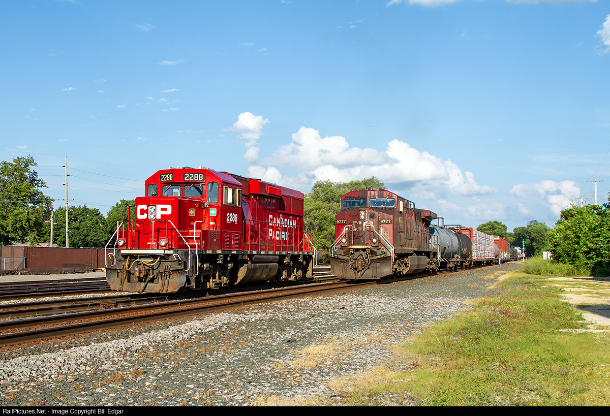 | CP 2288 shows off its nice red color scheme while CP 9777 passes by as a DPU on an eastbound freight at Winona, MN. The big GE is typical of a majority of CP road power in terms of the image it presents to the public. CP 2288 handles switching and local work based out of the Winona yard. |