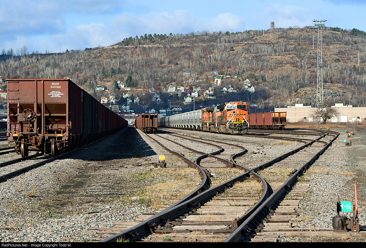 | Known as the City on the Hill, Duluth, MN with the 80-foot tall Enger Tower perched 450 feet above Lake Superior providing the backdrop as a BNSF grain train rolls into the yard at Rices Point. |