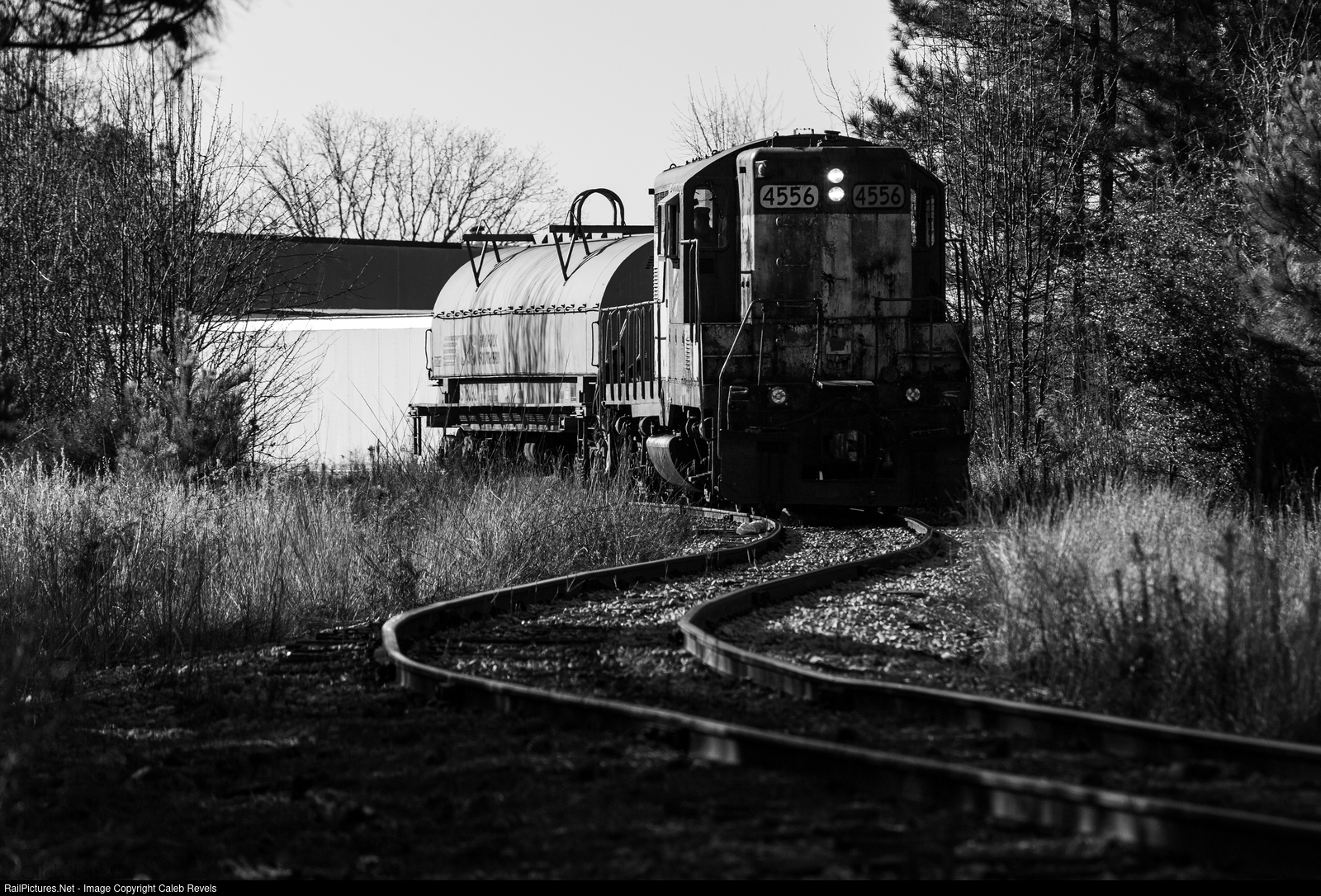 | Hartwell 4556, still wearing its CNW colors, shoves down the spur into Greif to pull a single covered hopper. |
