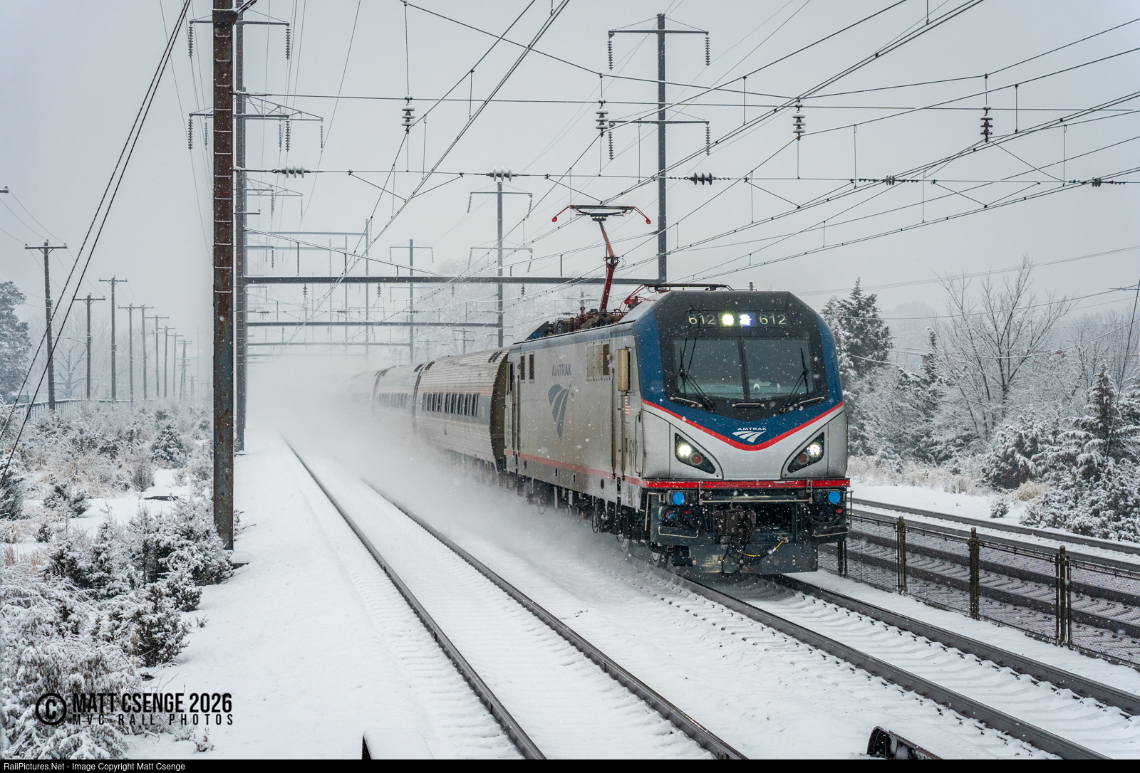 Amtrak ACS-64 no. 612 is seen leading Silver Meteor train 98 east through Pennsylvania, approaching Croydon Station. |