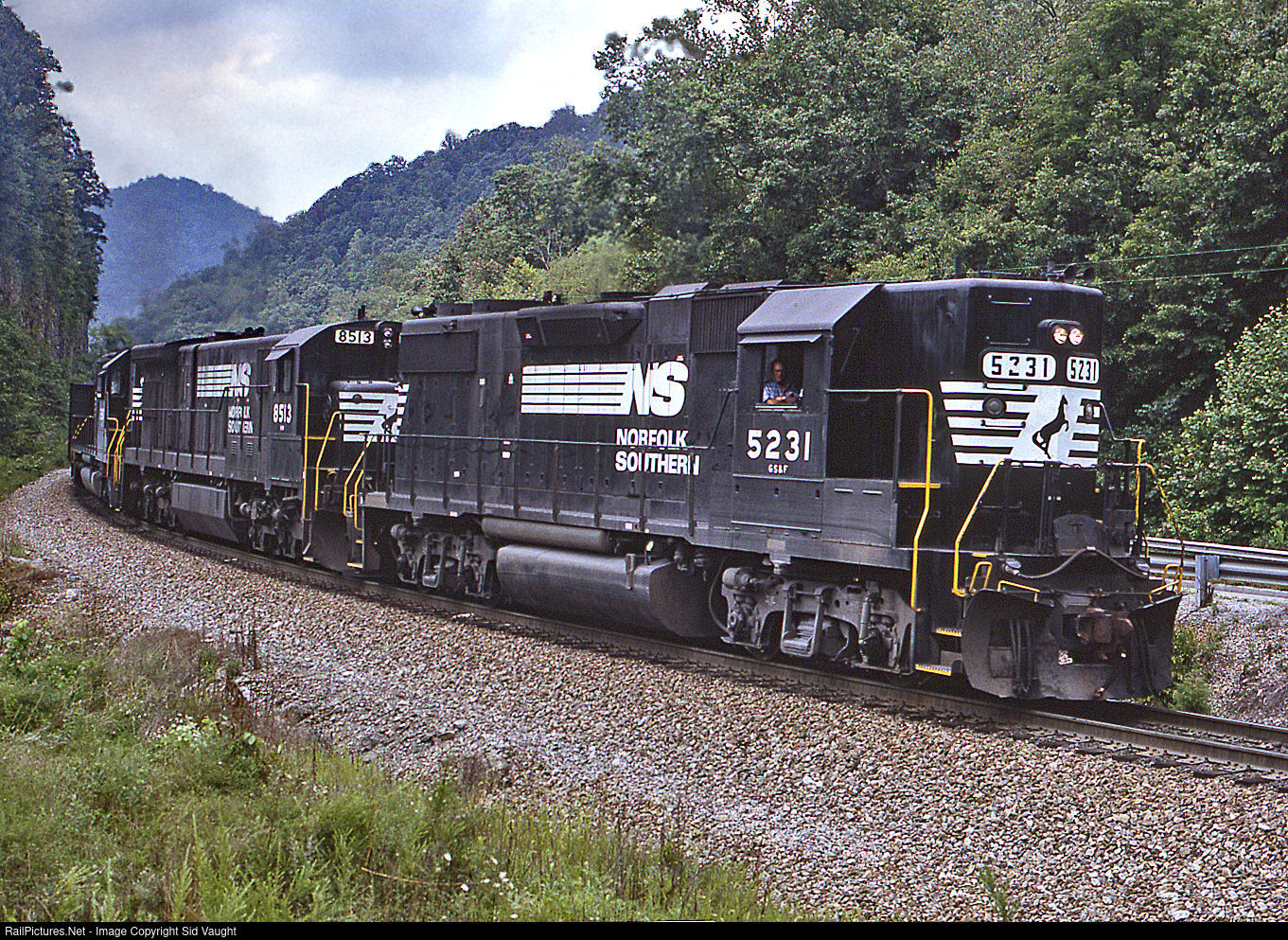 | For the last 1/2 mile or so to the Clinch River, NS, CSX, US 23 and Troublesome Creek follow a narrow defile between high hills. This Eastbound coal train is exiting a shelf blasted from solid rock that carries the former Southern tracks on its climb to the summit in a deep cut named appropriately, Deep Cut. They will drop the helpers at the siding at CP Watkins. |