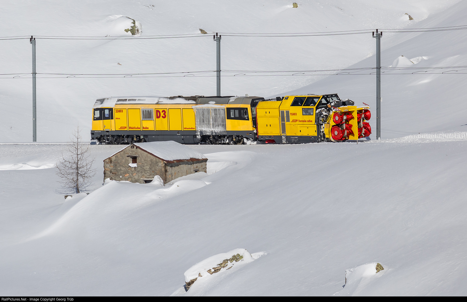 | The snow fighting crew from Pontresina is on the way back home as service train 80 from Ospizio Bernina. "Schalke" diesellocomotive Gmf 234 # 03 pulls the "Zaugg" snow blower X rot mt # 95403 around the "Jochum curve" in the Bügliet valley near Ospizio Bernina. |