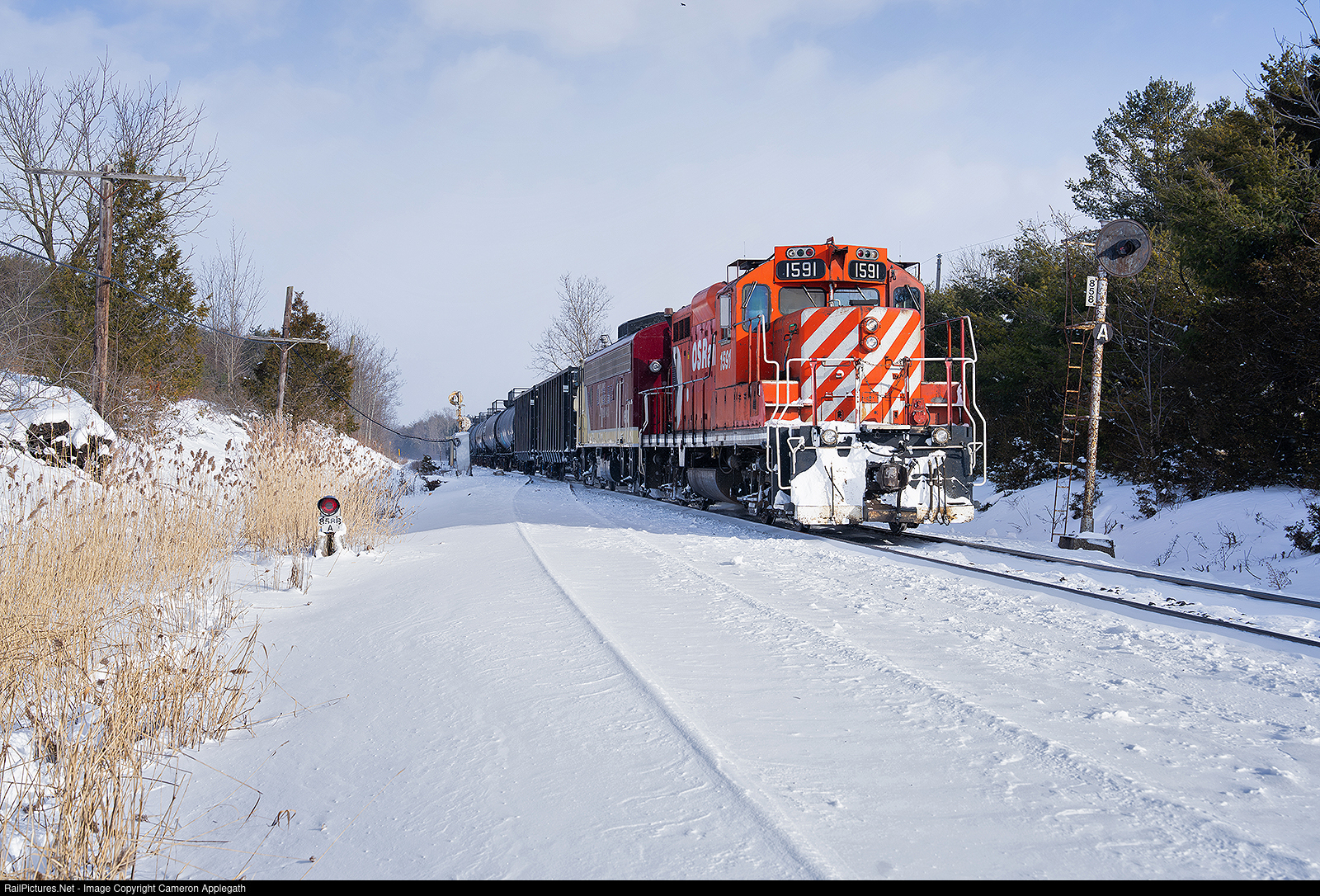| The snow is fresh and the sun is out as Ontario Southland's Woodstock job knocks down the signals protecting to the east end of Coakley siding after running the power around their train for the trip back west along the St. Thomas Subdivision towards Ingersoll.