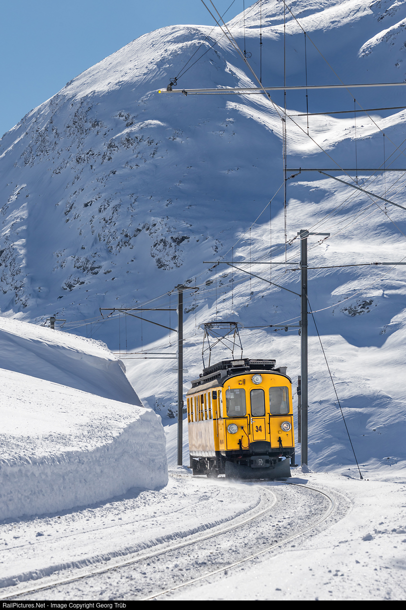 | Railcar ABe 4/4 # 34 of the Rhaetian Railway, built in 1908 by SIG and SAAS as BCe 4/4 # 4 for the Bernina Railway, is running along the Lago Bianco, entering Ospizio Bernina, as extra train 92627 from Pontresina to Alp Grüm, for a small foreign group. |