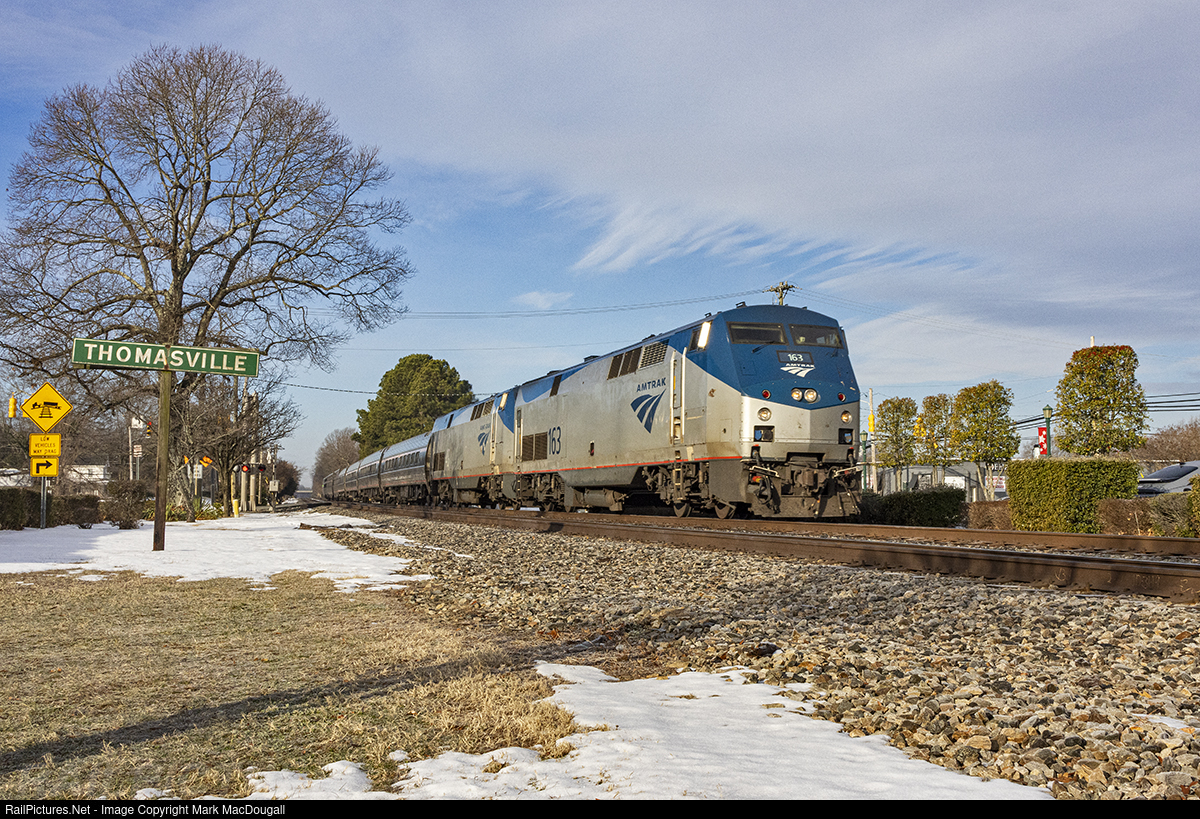 | The northbound Crescent hustles through Thomasville behind a pair of P42s. Remnants of the foot of snow central NC received the prior weekend are still visible at a location where any snowfall is uncommon. |