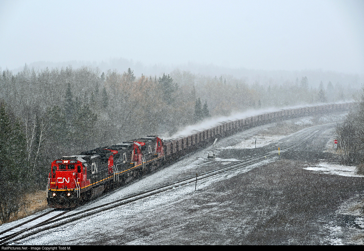 | It's snowing fast and furious as three Dash 8's descend the Minntac Sub with roughly 15 thousand tons of taconite pellets heading for Two Harbors, MN. |