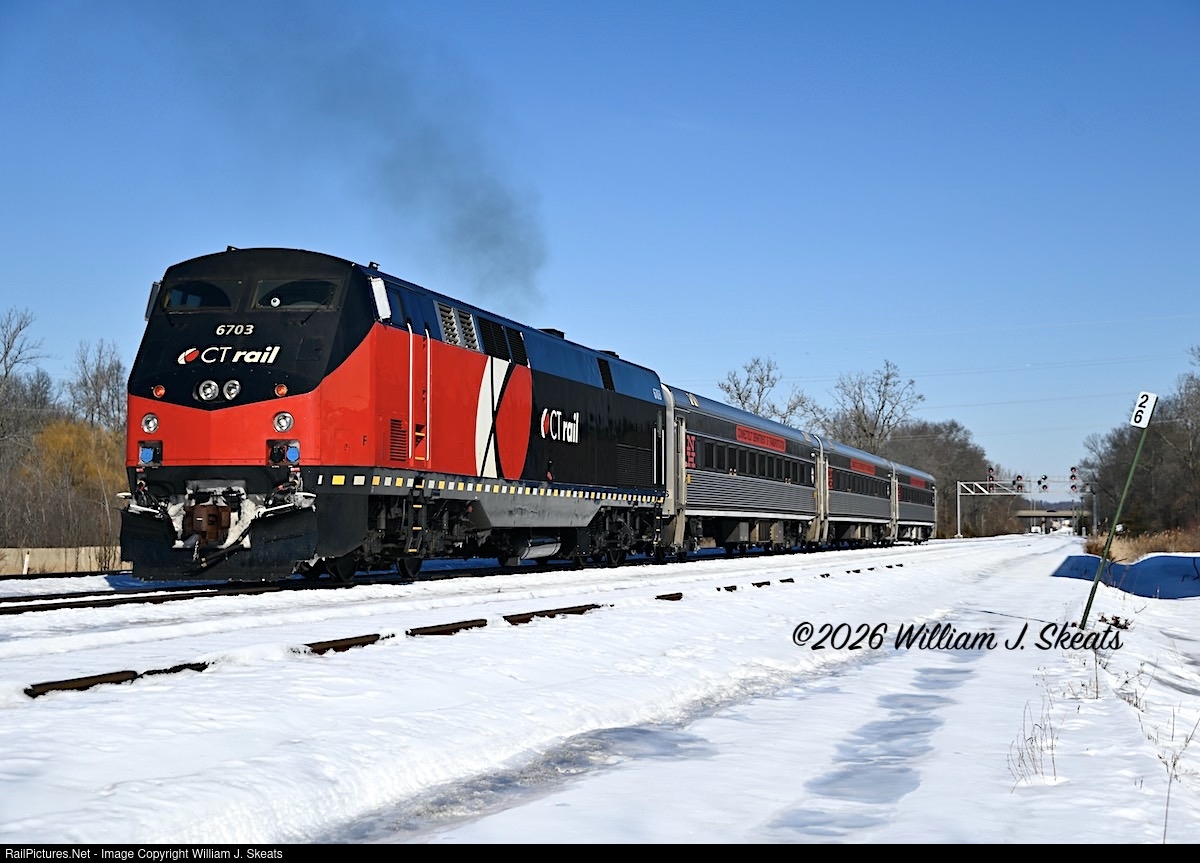| CTrail Train 4406 heading towards Hartford on the Amtrak MRS Line at MP 26 after leaving Berlin Station. The red and black colors of CTrail scheme looks sharp in the snow.