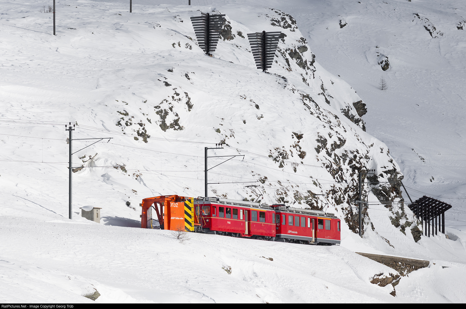 | On the occasion of the steam snow blower adventure experience, the railcars ABe 4/4 # 46 and # 47 of the Rhaetian Railway in multiple control pull the snow scratch Xk # 9132 along the Lago Bianco on the Bernina pass between Ospizio Bernina and Alp Grüm. |