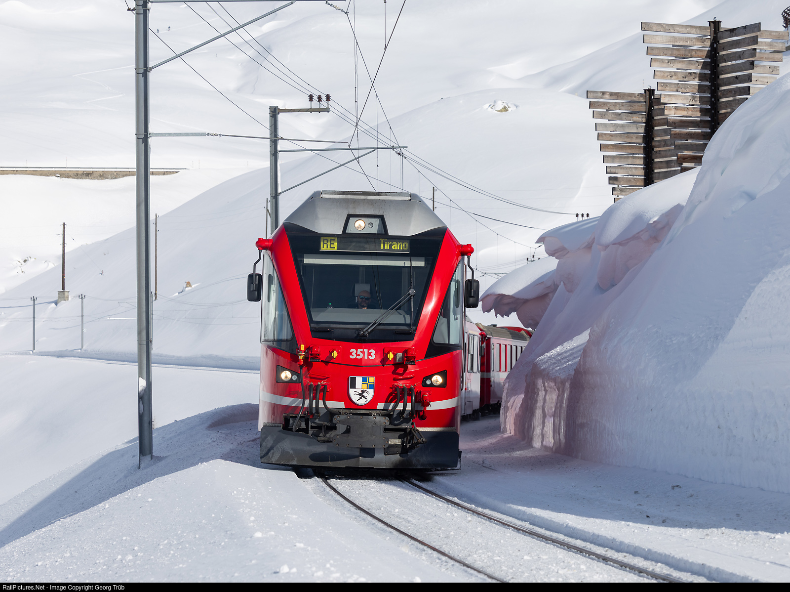 | "Allegra" ABe 8/12 # 3513 of the Rhaetian Railway pulls the train 1625 of the line RE9 from St.Moritz to Tirano along the Lago Bianco on the Bernina pass, between Bernina Lagalb and Ospizio Bernina. On the right, you can see so-called crosswind deflectors (in german Kreuzkolktafeln), which are designed to minimize snow accumulation in the area of the railway line by disrupting the wind flow. |