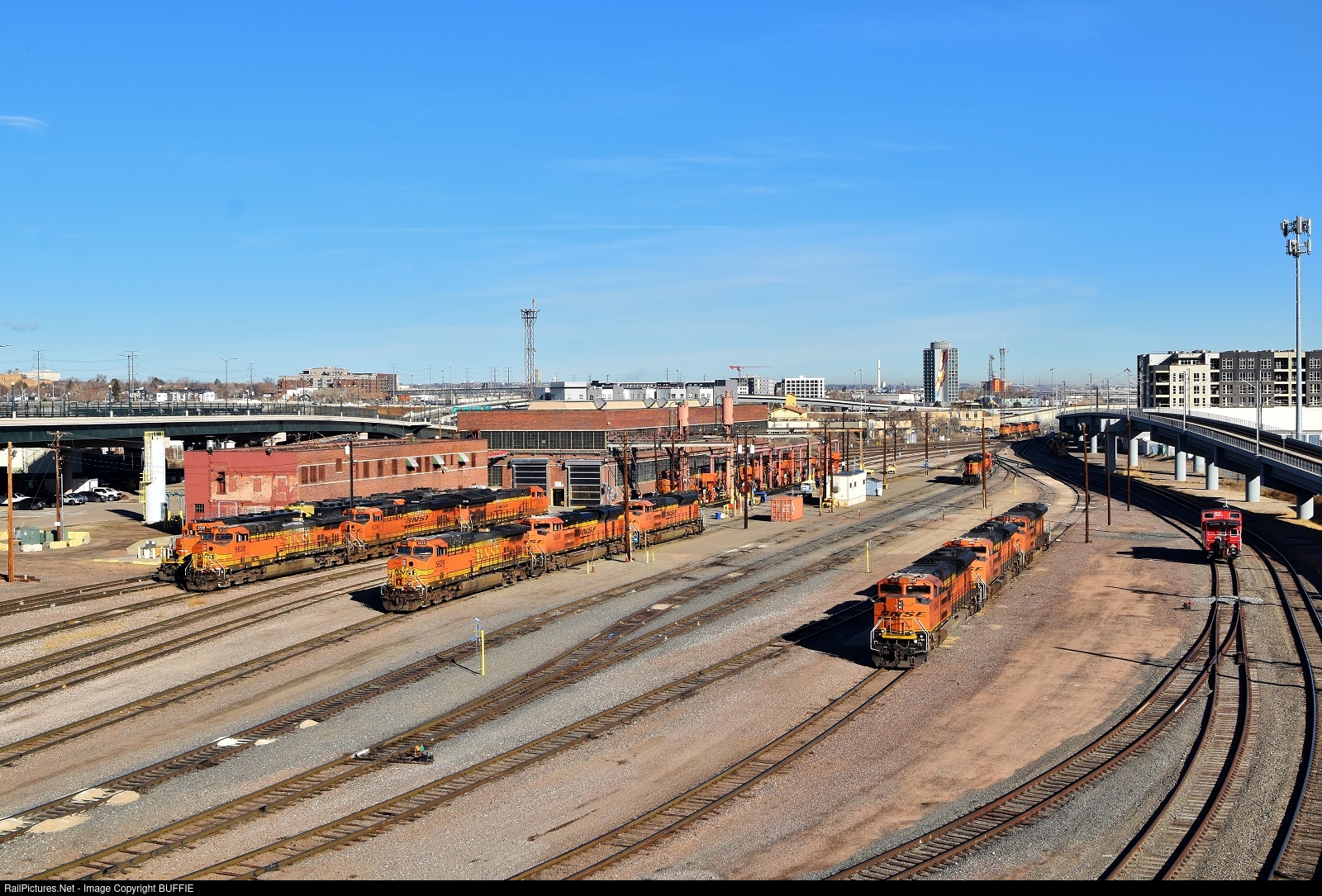 Here is a wide-angle view of the BNSF engine servicing yard in downtown Denver, Colorado.