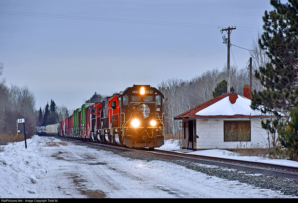 Recently receiving a new main generator by the shop crew at the Proctor Diesel House, IC 1032 was released and trailed CN's L567 up to Ranier, MN the day before and the rule is what goes up must come down so it led back on L568 on a dreary Sunday morning with an SD60, a SD40-3, and a AC44C6M trailing along with the daily freight passing the former depot at Saginaw, MN.