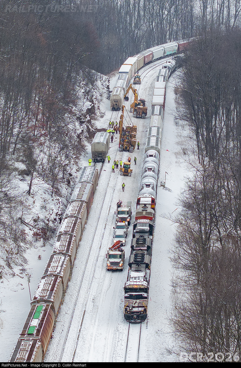 | Crews work hard to rerail over 50 cars along the Scotch Run curve. For over 48 hours the Pittsburgh Line was reduced to only one track between Altoona and MG with trains being tied down and "fleeted" past the derailment site. |