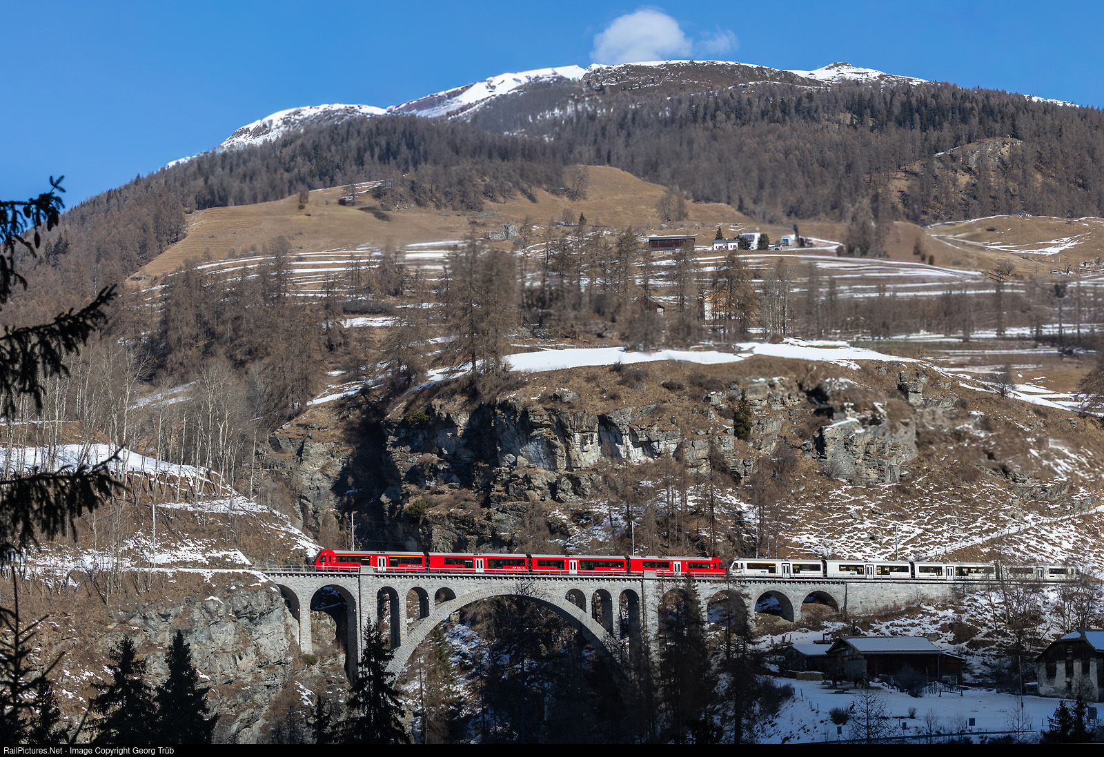 | "Capricorns" ABe 4/16 # 3121 and # 3133 (in the Champagne color) of the Rhaetian Railway in multiple control are crossing the 110 meter long and 41 meter high Val Tuoi viaduct between Guarda and Lavin with the RE 1236-1036 of the line RE4-RE24 from Scuol-Tarasp via Vereina-Klosters to Landquart. |