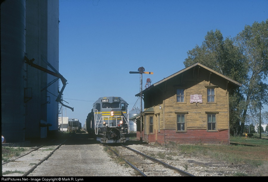 | IANR 3803 leads 2 more IANR GP38-3's and a handful of cars past the classic two-story former Rock Island depot at Rockford, IA on a gorgeous midwestern fall afternoon. |