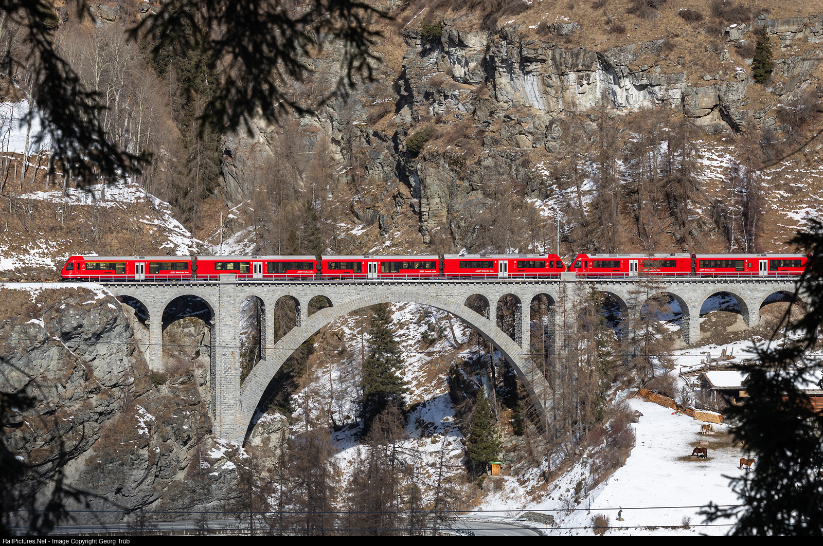 | "Capricorn" trains ABe 4/16 # 3131 and # 3112 of the Rhaetian Railway in multiple control are running the RE4-RE24 service 1240-1040 from Scuol-Tarasp via Klosters to Landquart. The train is crossing the 41 meter high and 110 meter long Val Tuoi viaduct between Guarda and Lavin, built in 1912 when the line was built. |